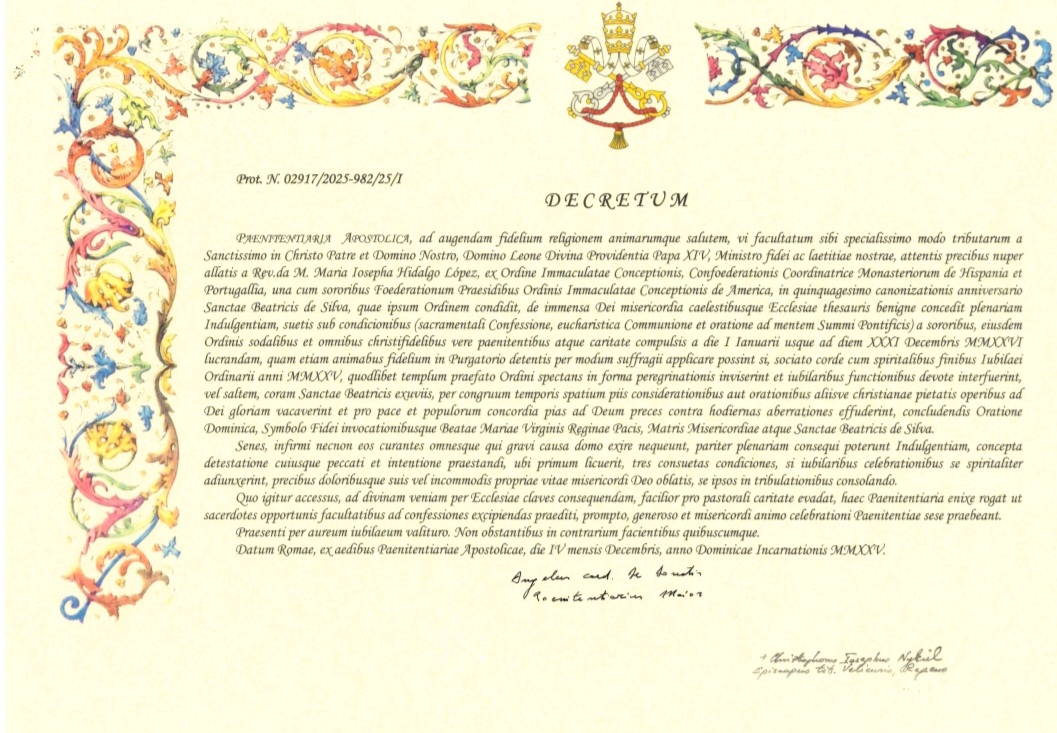 A PENITENCIARIA APOSTÓLICA, para aumentar a devoção entre os fiéis e para a salvação das almas, em virtude das faculdades especiais concedidas pelo Santo Padre em Cristo Nosso Senhor, pela providência de Deus, o Papa Leão XIV, ministro da fé e para a nossa alegria, atendendo a recente solicitação apresentada pela Reverenda Madre Maria José Hidalgo Lopez, da Ordem da Imaculada Conceição, Coordenadora da Confederação dos Monastérios da Espanha e de Portugal, juntamente com as Irmãs Presidentes das Federações da Ordem da Imaculada Conceição da América, no quinquagésimo aniversário da canonização de Santa Beatriz da Silva, fundadora da referida Ordem, benignamente, concede, pela imensa misericórdia de Deus e pelos tesouros celestiais da Igreja concede a Indulgência plenária, conforme as condições habituais (de Confissão